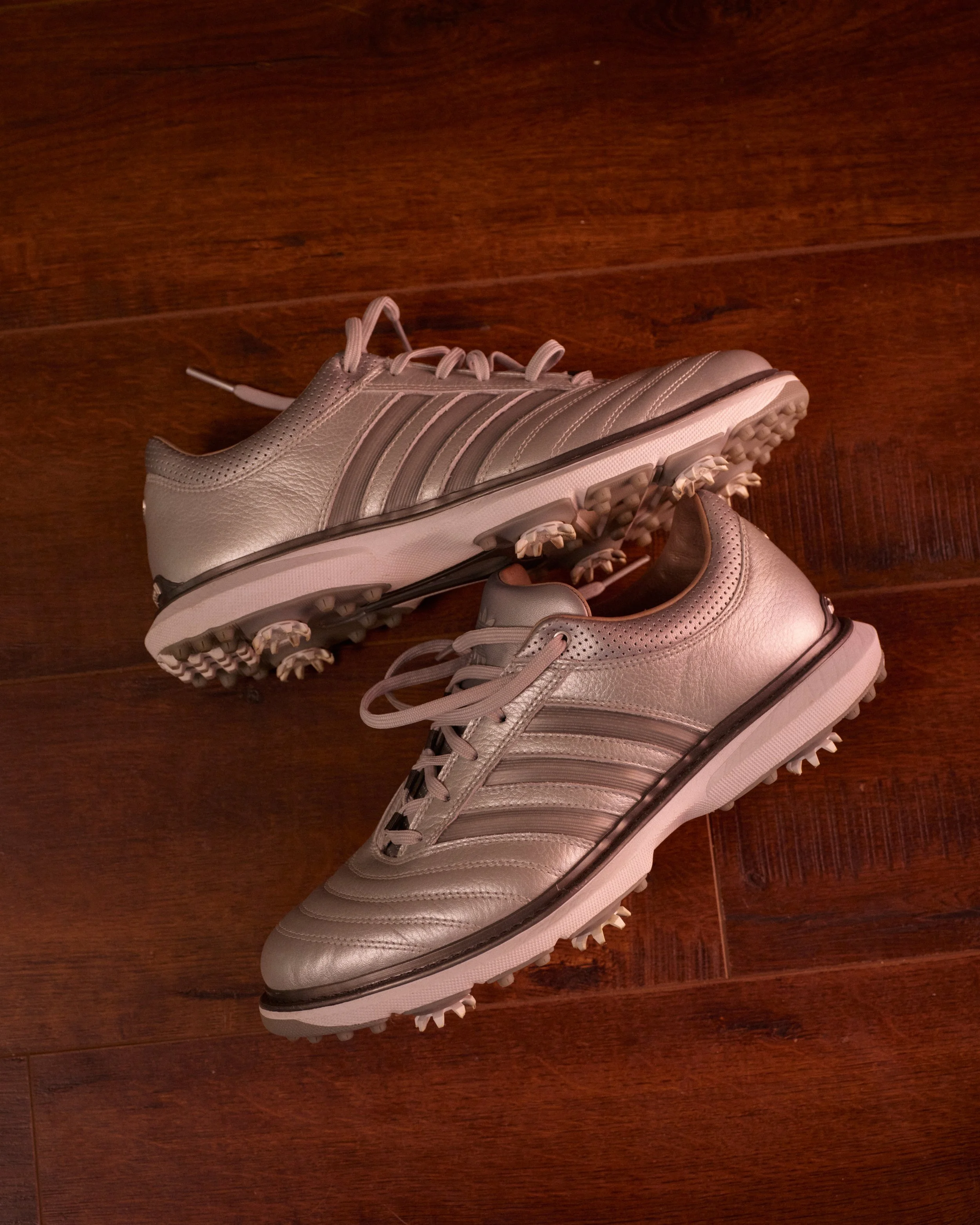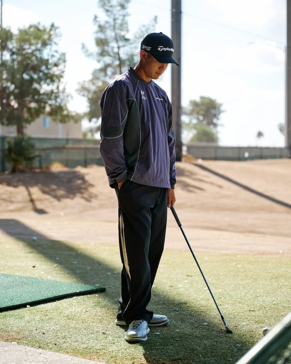 The hero piece may be the trousers with zippered leg vents that reveal Three-Stripe detailing beneath, a subtle flex between performance and statement. The polo carries mid-2000s Teamgeist references. The MC70 footwear draws from 90s football boots, complete with deco-stitched leather uppers, updated with modern golf tech underfoot.